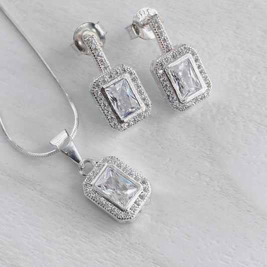 Square Baguette Halo Studs and Pendant Set